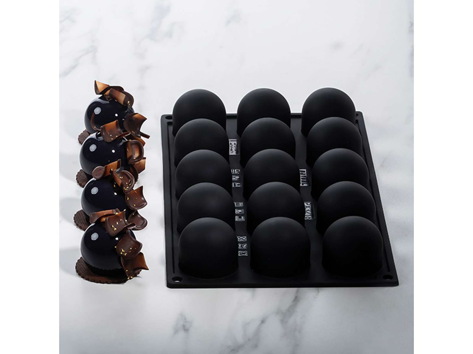The Pavoni Pavoflex Sphere40time is a professional silicone mold developed in collaboration with renowned pastry chef Antonio Bachour. With 15 spherical cavities on a single tray, this mold allows you to create consistent, professional desserts with the exact same size and shape every time. The black silicone mold measures 300x175 mm and features cavities with a diameter of 43 mm.