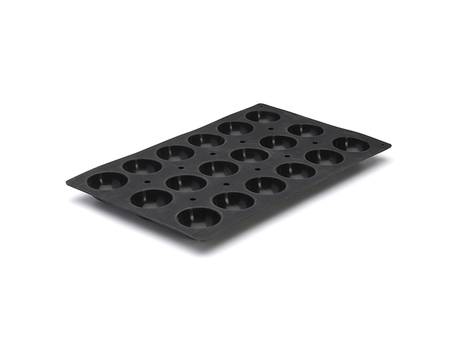 The mold's perforated base with the patented R'System® is key to its high performance. This system ensures optimal air circulation and even heat distribution during baking or freezing. This means that all 18 half-spheres achieve identical consistency, color, and flavor. The black color effectively absorbs heat, resulting in quicker and more uniform baking. With a diameter of 70 mm per half-sphere, you get the perfect portion size for elegant dessert presentations.