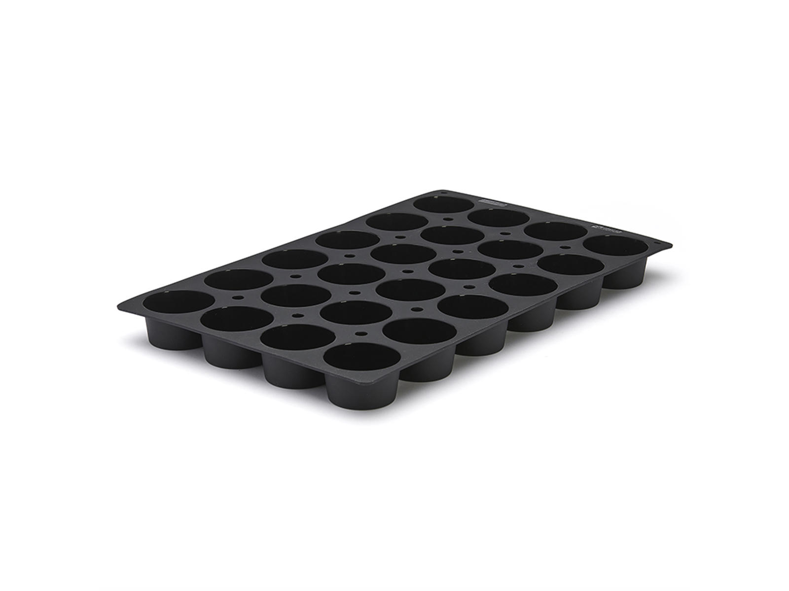 The R'System® technology with strategic perforations creates even air circulation, ensuring uniform baking across all 24 molds. The black silicone effectively absorbs heat, reducing baking time and promoting more even caramelization. The smooth interior of the mold acts as a natural non-stick surface, allowing your baked goods to easily release without the need for large amounts of fat.