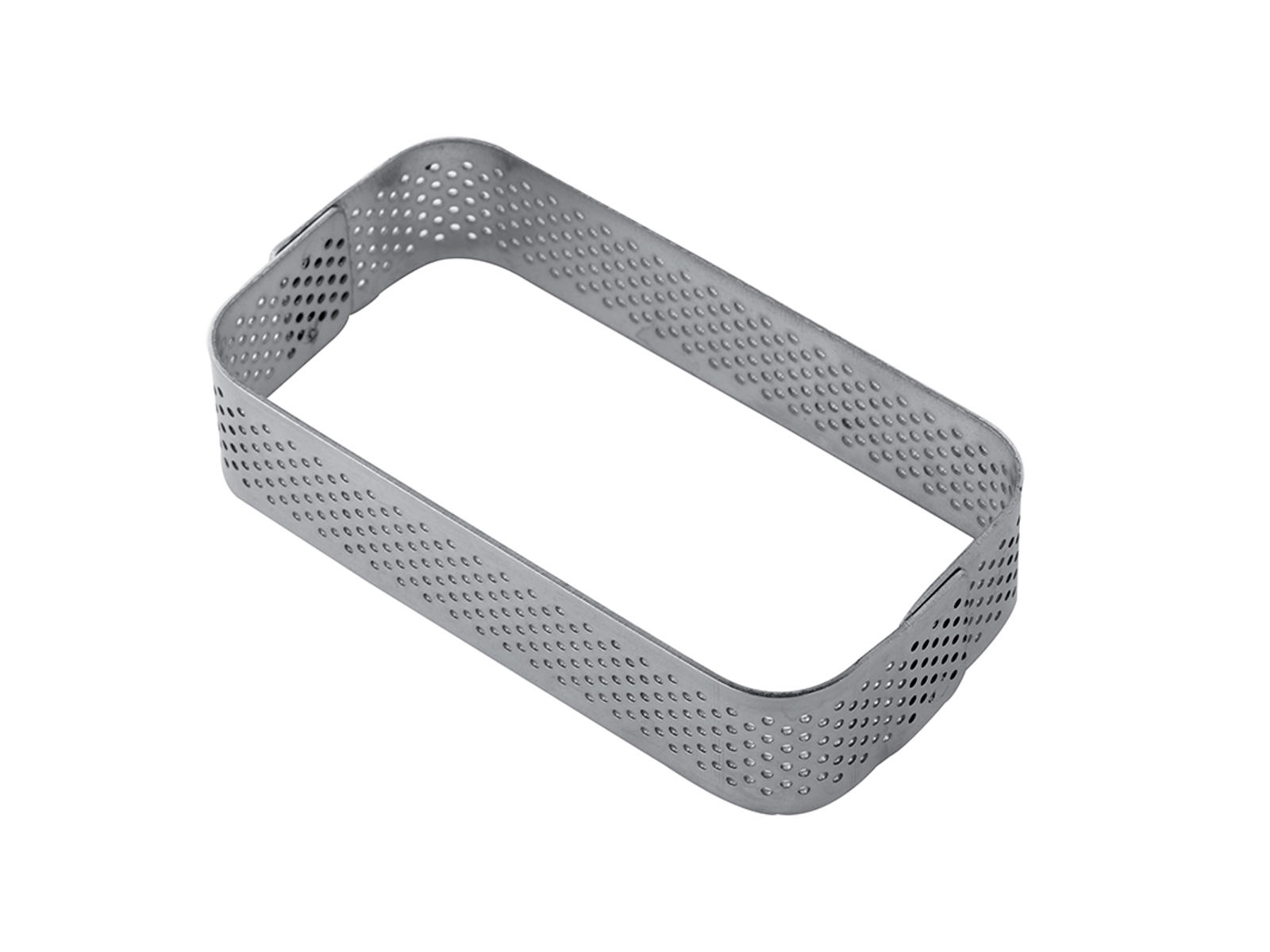 The baking ring measures 65 x 65 mm with a height of 20 mm, making it perfect for smaller portion servings. It is made from durable stainless steel with a micro-perforated design that ensures optimal heat distribution. Its square shape adds a modern, geometric touch to your desserts and tarts while remaining stable during baking.