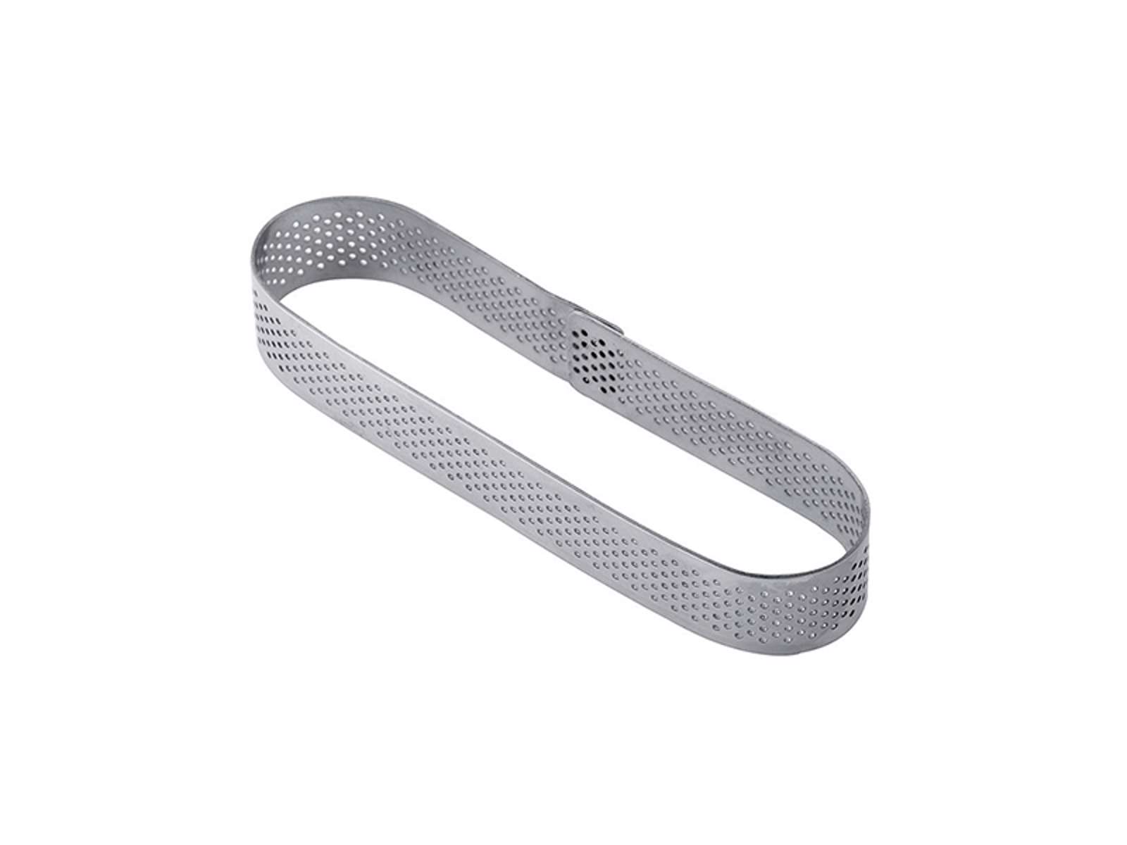 This perforated baking ring from Pavoni, made of stainless steel, allows you to create perfect oval tarts and desserts. With its precise dimensions of 125 x 30 x 20 mm, this mold is ideal for crafting uniform individual portions that not only look professional but also bake evenly thanks to the micro-perforated construction.