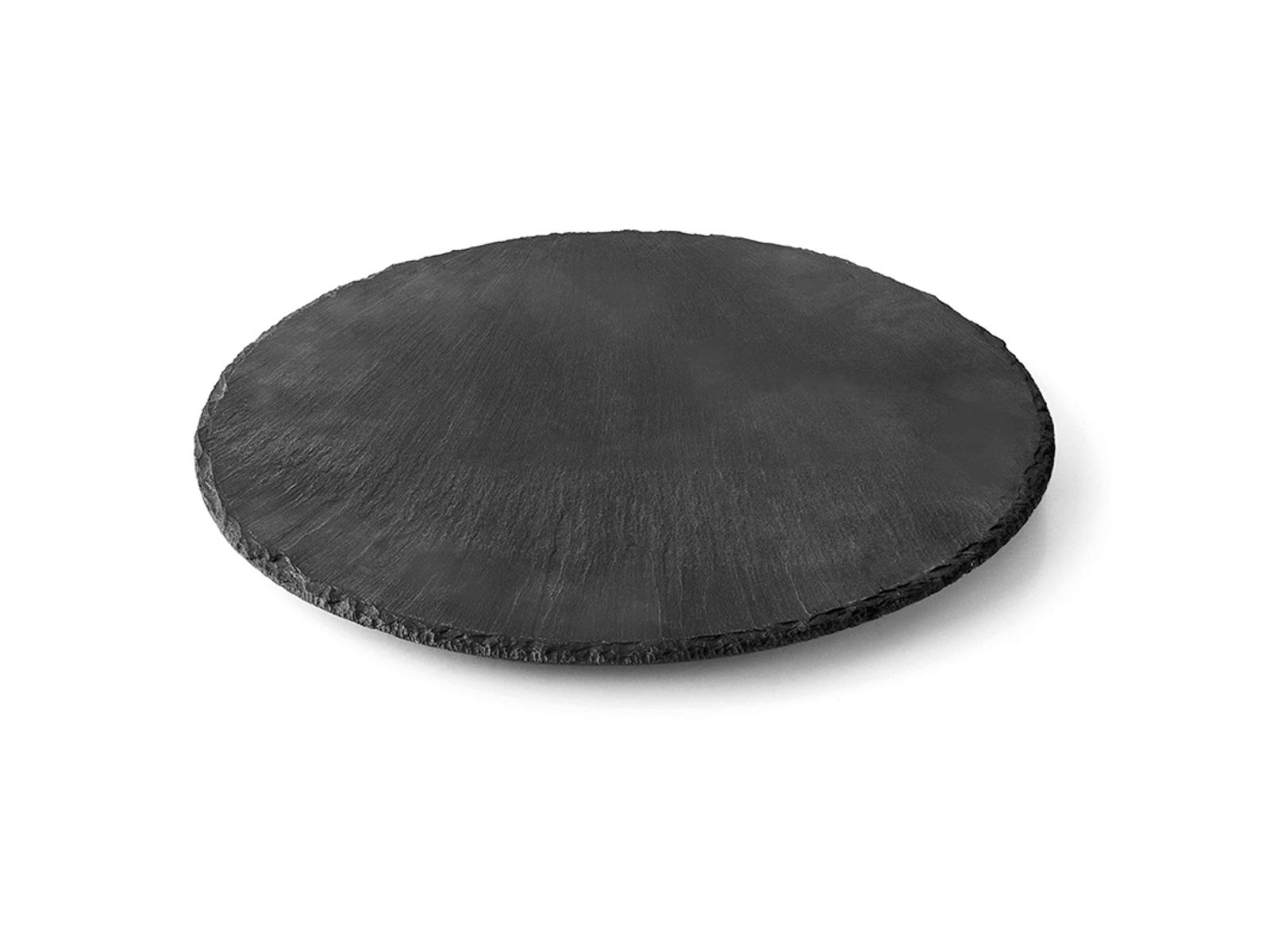 The stand has a diameter of 35 cm and a height of 25 mm, providing a spacious serving area. Weighing 2.1 kg, it has a good weight that ensures stability during use. The black slate surface is beautifully complemented by the stainless steel base, offering a modern and timeless expression.