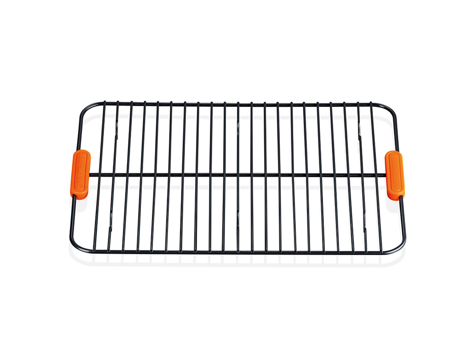 This spacious cooling rack from Le Creuset, measuring 41x30 cm, is made from durable carbon steel with an effective non-stick coating. The raised legs ensure optimal air circulation beneath your baked goods, while the heat-resistant silicone edges provide a secure grip—even when the rack is hot. Ideal for cooling, glazing, and decorating everything from cookies to large cakes.
