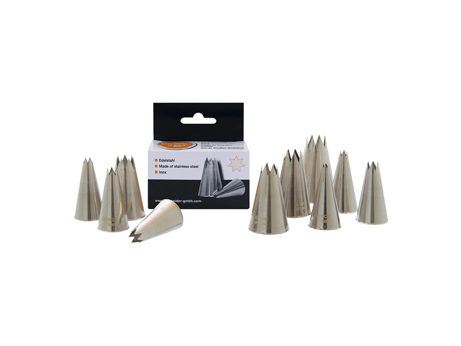 This professional nozzle set from Schneider includes 10 stainless steel star nozzles. With diameters ranging from 4 mm to 15 mm, the set allows you to create both fine details and larger decorative patterns. Each nozzle is crafted without seams, ensuring smooth and consistent decoration every time.