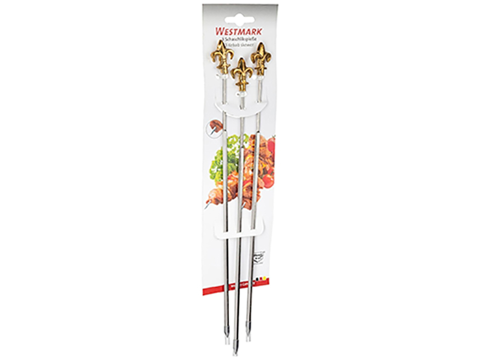 These premium grill skewers from Westmark are made from stainless steel with decorative brass handles designed in a lily motif. The set includes three 23 cm long skewers, whose flat shape ensures that meat and vegetables do not rotate during cooking. The sharp tips make it easy to secure the ingredients.