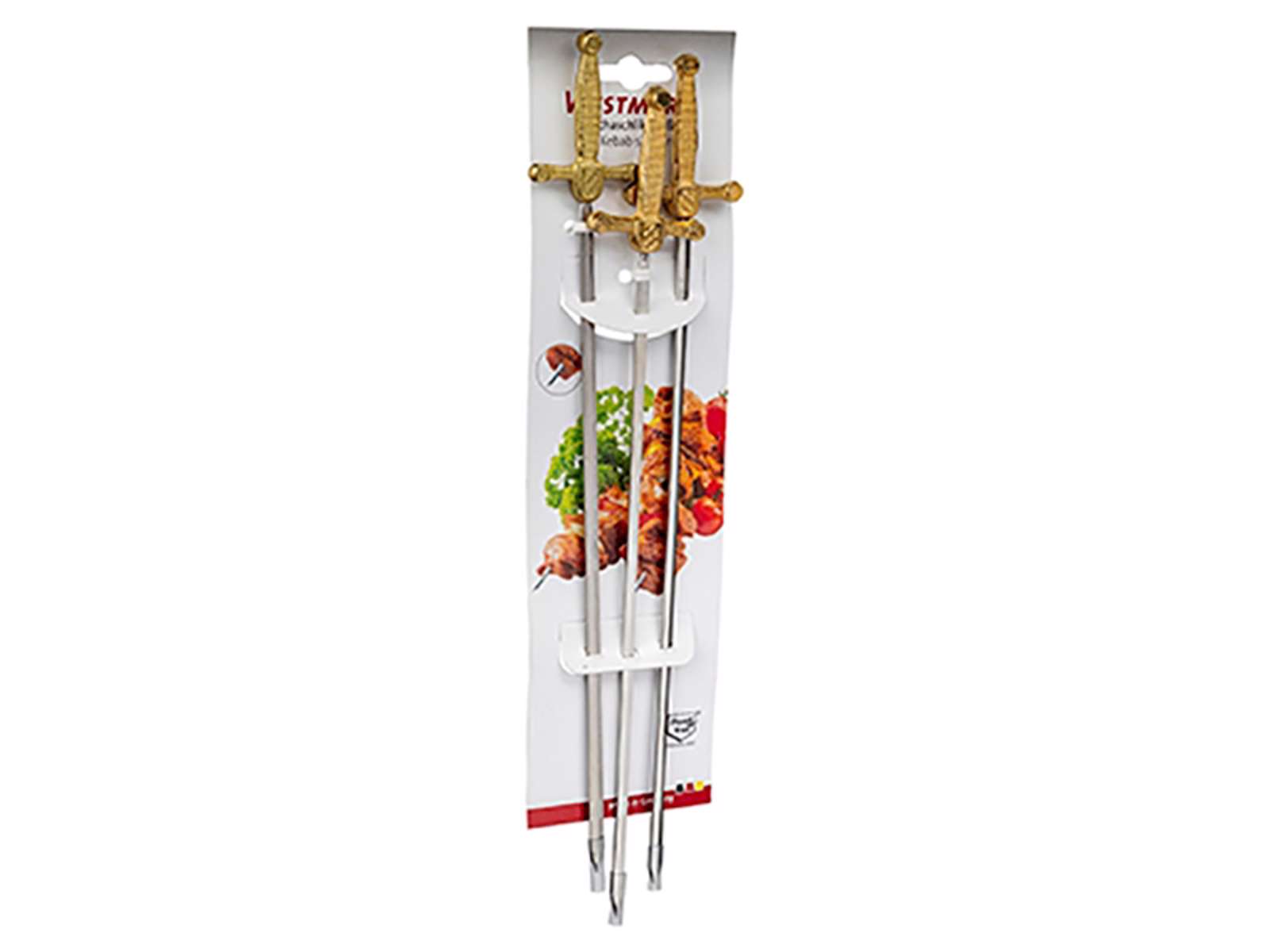 These Westmark grilling skewers come in a set of 3, each measuring 32 cm in length. The width is 47 mm and the height is 9 mm, providing a good surface for holding ingredients in place. The skewers are made of stainless steel with decorative brass handles. To maintain the quality of the product, it is recommended to clean the skewers by hand.