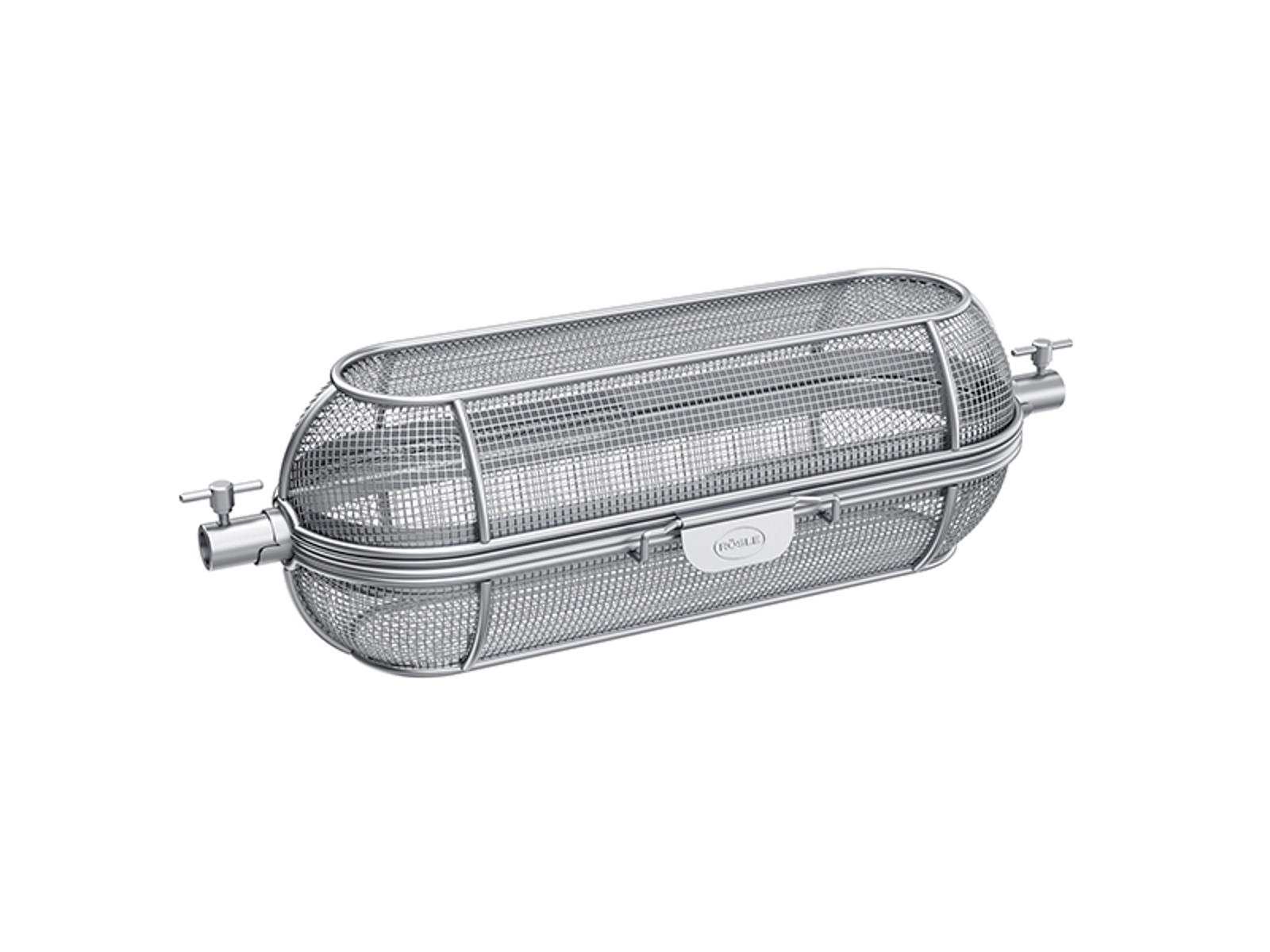 The rotisserie basket is crafted from stainless steel 18/10, which not only provides a robust construction but also ensures optimal heat distribution during cooking. The fine-mesh wire net is carefully designed to securely hold even smaller food items inside the basket while allowing heat to circulate freely around the food. This design enables you to cook food with a consistent, golden surface, as the basket rotates evenly over the grill's heat, exposing all sides to the same level of intensity.