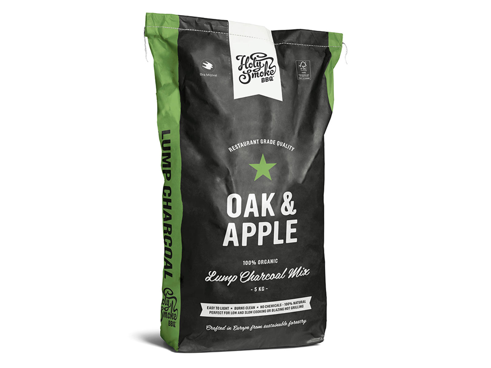 The bag contains 5000 grams (5 kg) of charcoal with a composition of 70% oak and 30% apple wood. This quantity is sufficient for several grilling sessions, depending on your grill size and the desired cooking time. Holy Smoke BBQ's charcoal is FSC-certified, ensuring sustainable forest management.