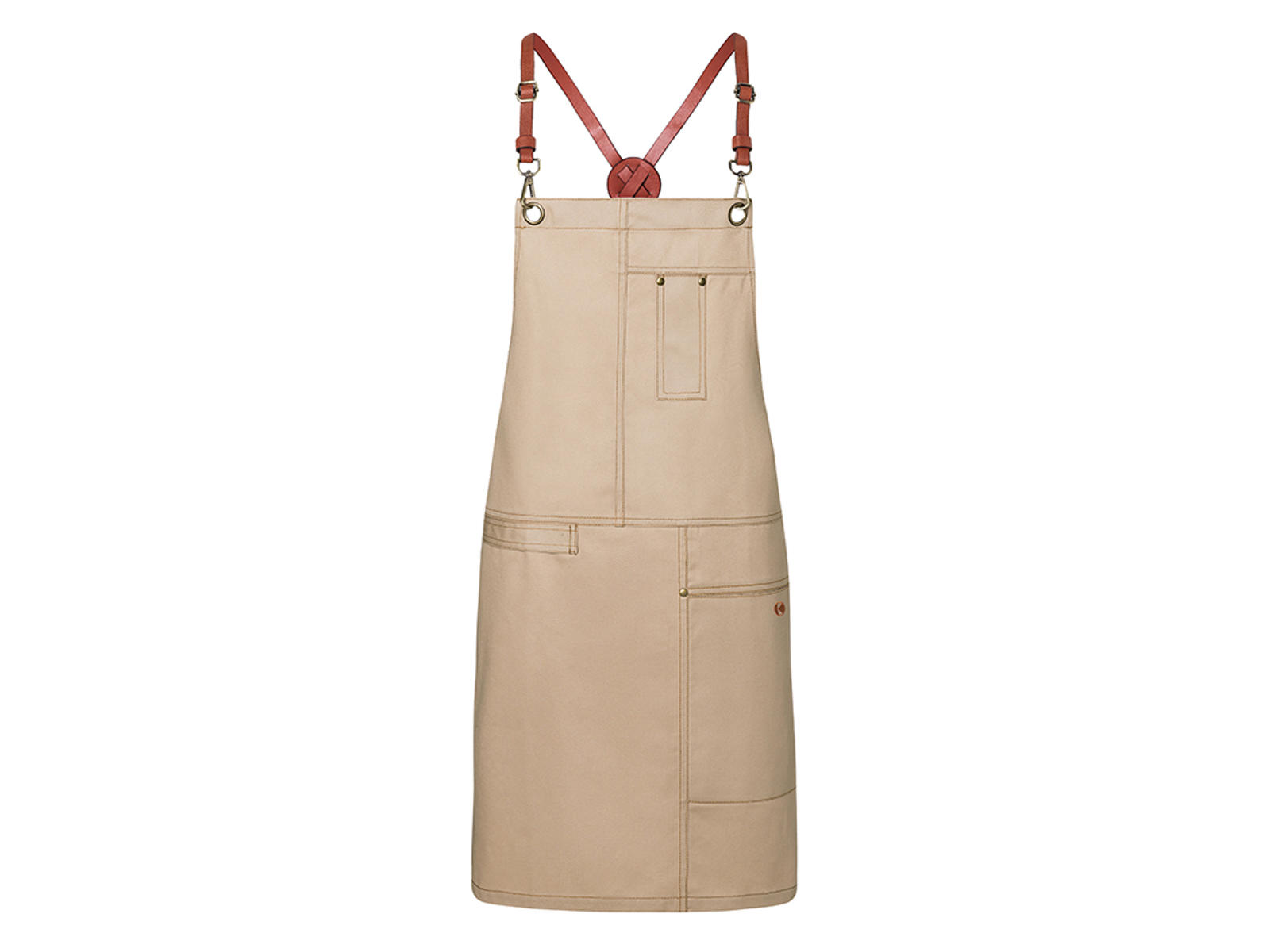 This sand-colored apron with leather straps from Karlowsky combines functionality with a rugged aesthetic. Measuring 68x80 cm, it effectively covers the work area, while the detachable leather straps provide a rustic touch without compromising comfort. Made from 100% cotton with a weight of 273 g/m², it ensures durability in busy work environments.