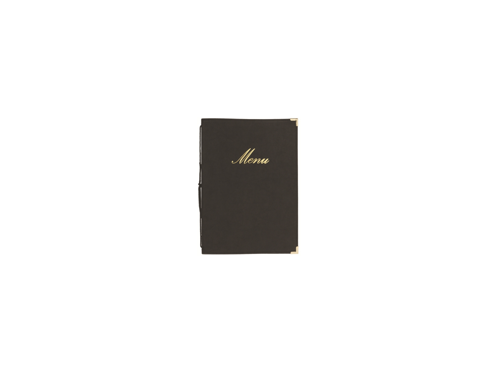 The menu card is designed with a focus on both aesthetics and durability. The gold-colored metal corners effectively protect against everyday wear while simultaneously giving an exclusive appearance. The front is elegantly embossed with the word "Menu" in gold lettering, highlighting the classic design. The stitched edge construction ensures that the menu card can withstand daily use in busy service environments without losing its shape or appearance.
