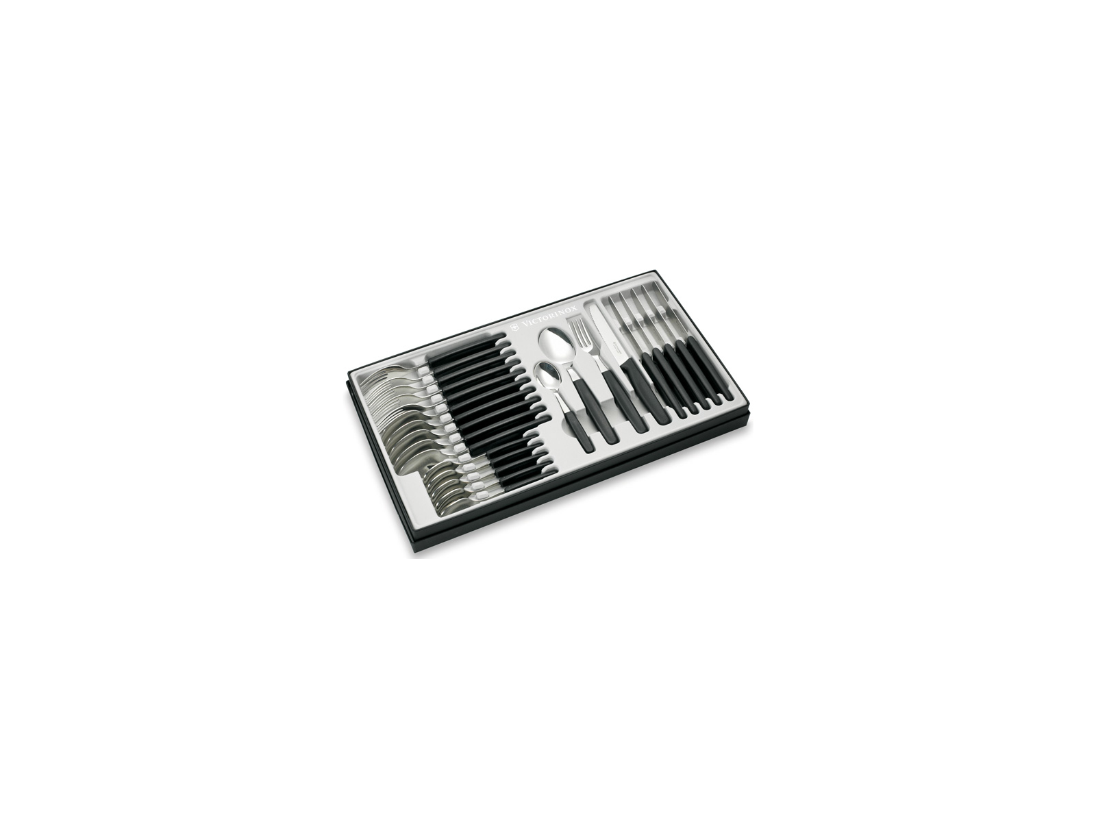 This Victorinox Swiss Modern cutlery set offers you 24 functional pieces in a timeless design, made from durable stainless steel with black Fibrox handles. The set includes all the necessary cutlery for six people and combines Swiss precision with modern aesthetics. It's perfect for everyday meals as well as entertaining guests.