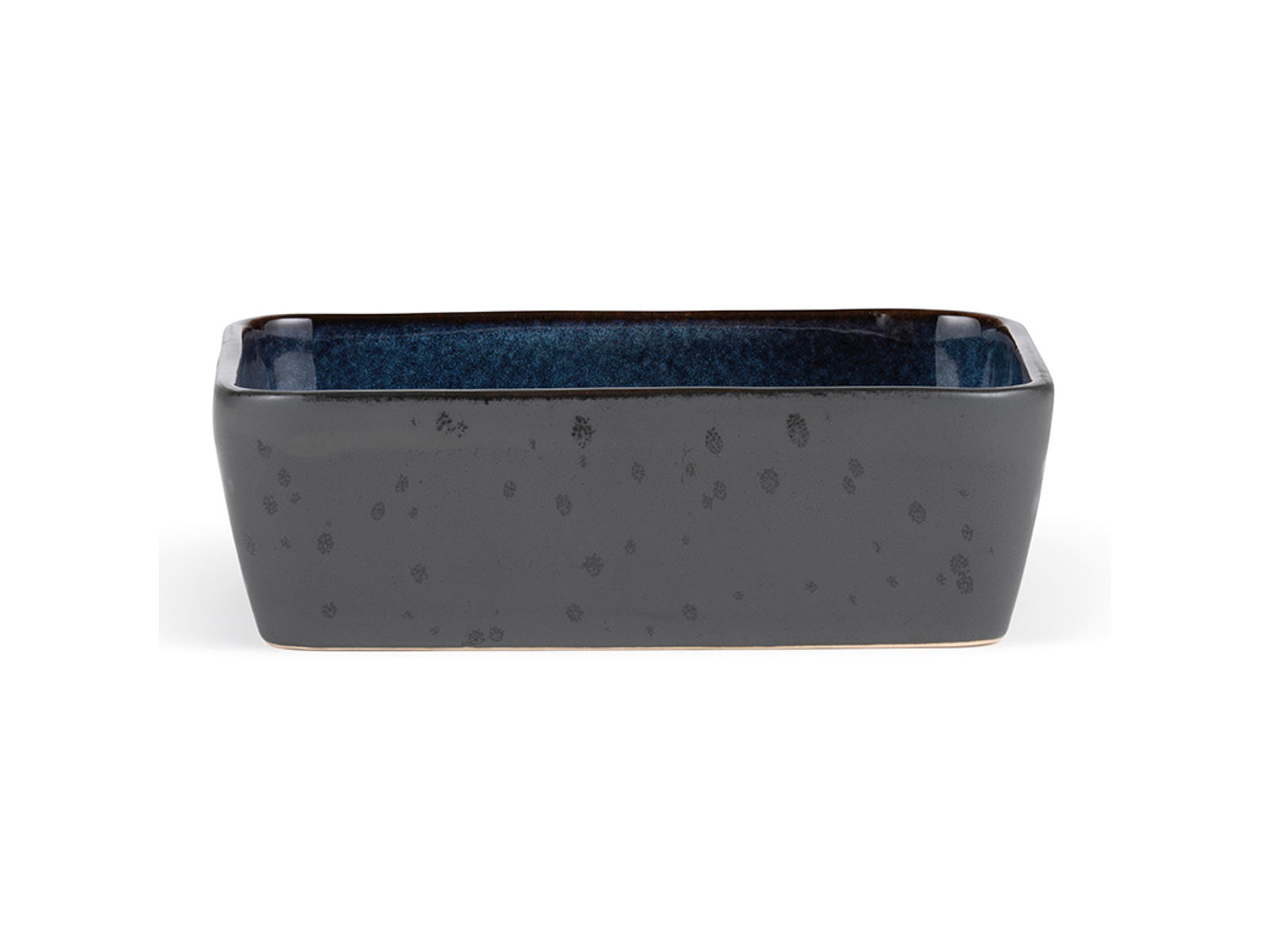 This rectangular platter from Bitz combines elegant design with practical functionality. Measuring 19x14 cm and standing 6 cm tall, the platter offers a stylish appearance through the contrast between the matte black stoneware exterior and the glossy dark blue glaze on the inside. The reactive glaze creates unique shades and patterns, making each platter a distinctive piece.