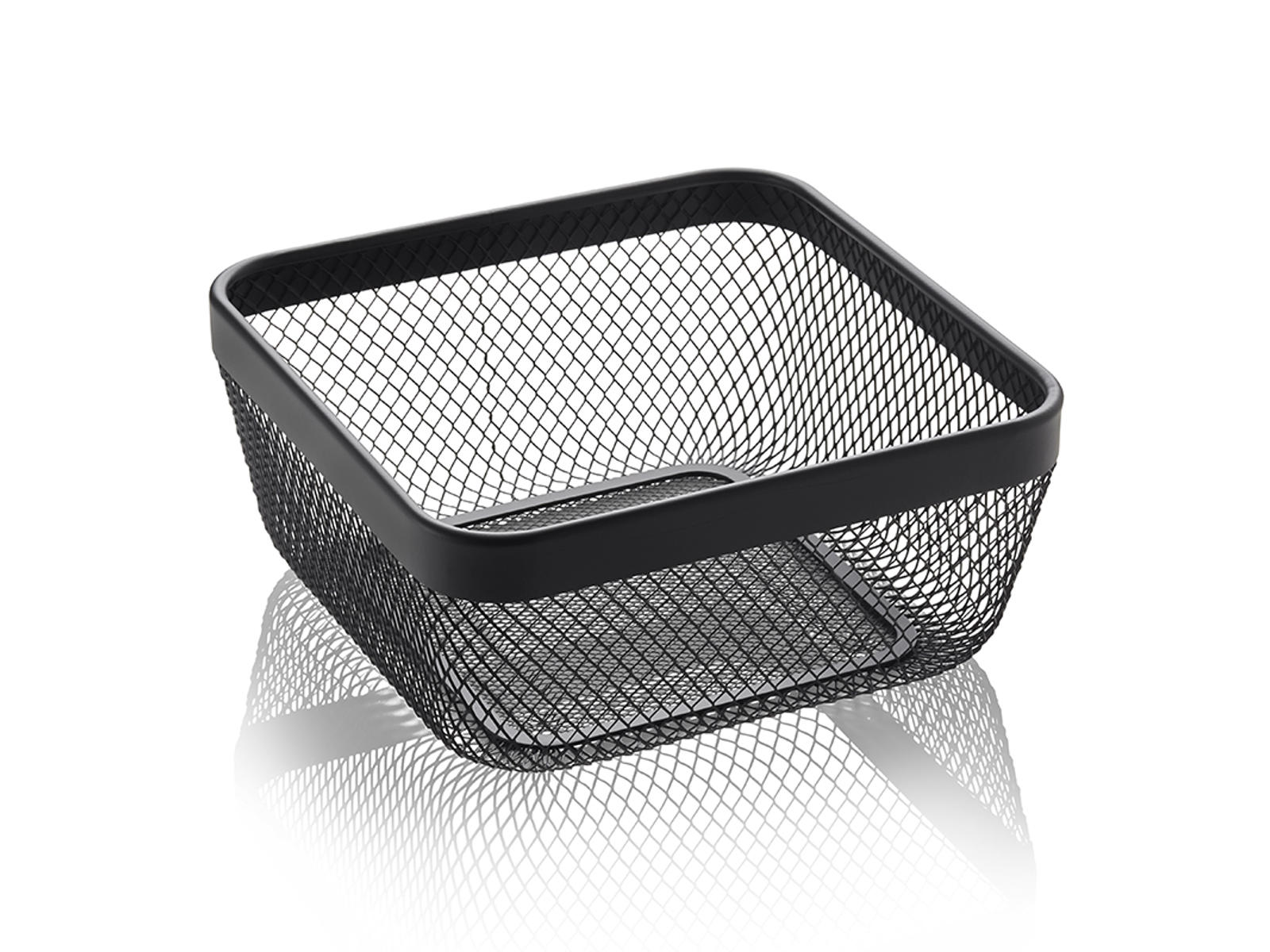 This black mesh basket measuring 24.5x24.5x11 cm is made from durable wood with a stylish mesh design. Its functional size and sturdy construction provide both practical storage space and a decorative element for your home. Weighing only 370 grams, it is easy to move around as needed.