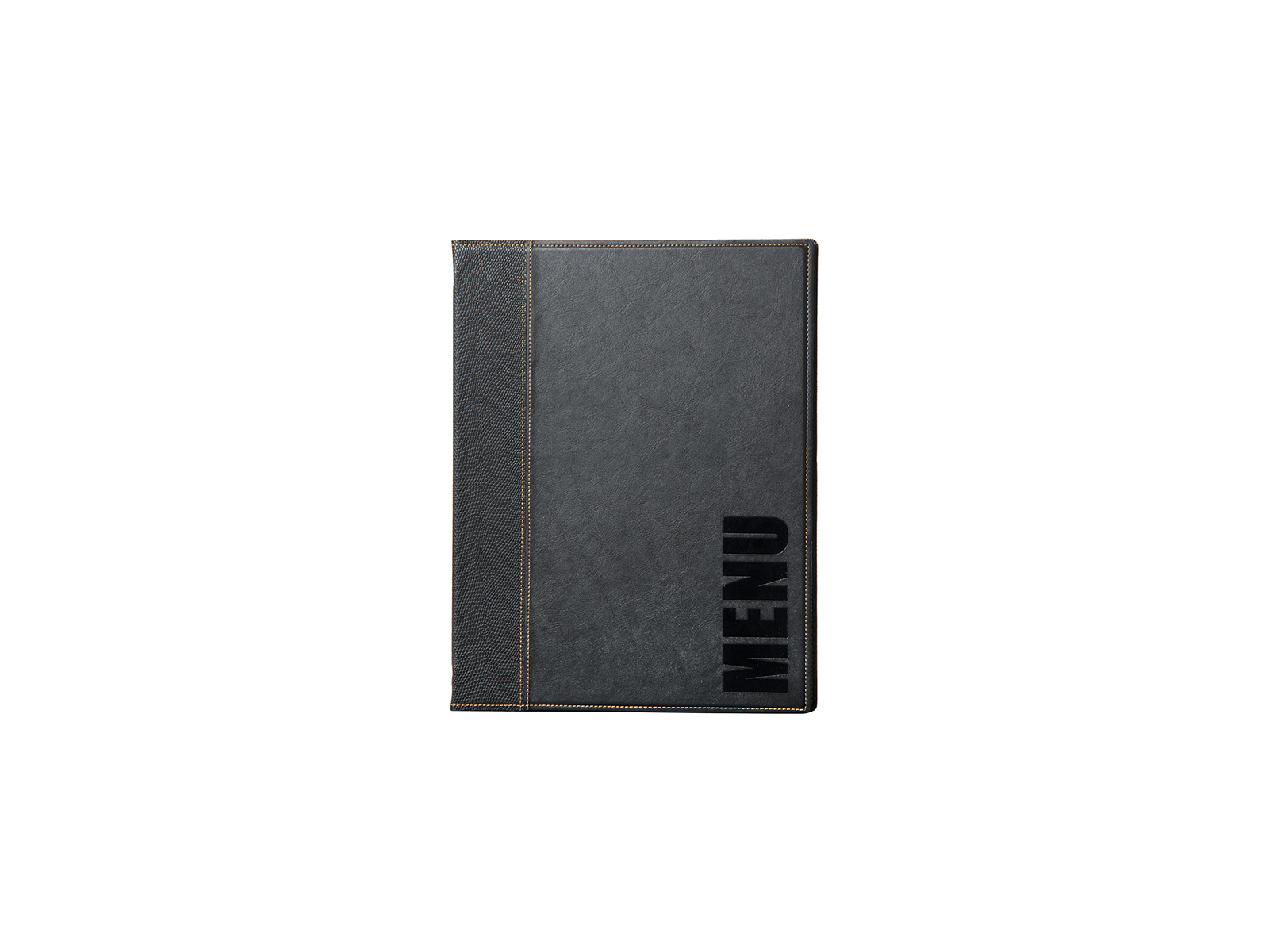 The menu card measures 353 mm in height, 186 mm in length, and has a depth of 10 mm. The black PU material provides a timeless look that fits into many different interior styles. The standard configuration includes space for 1 spread/4 pages but can be significantly expanded as mentioned.