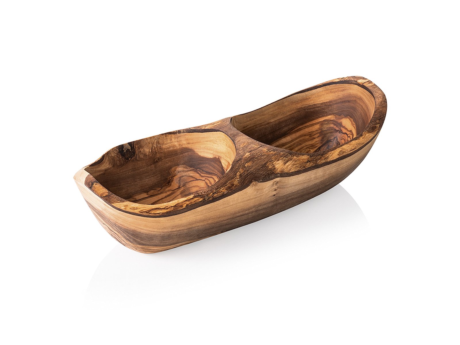 The bowl is made from natural olive wood and measures 25 cm in length, 11 cm in width, and has a height of 3.5 cm. It features two separate indentations, making it perfect for serving different foods at the same time. Each bowl is unique with individual grain patterns and color variations, adding an authentic touch to your table.