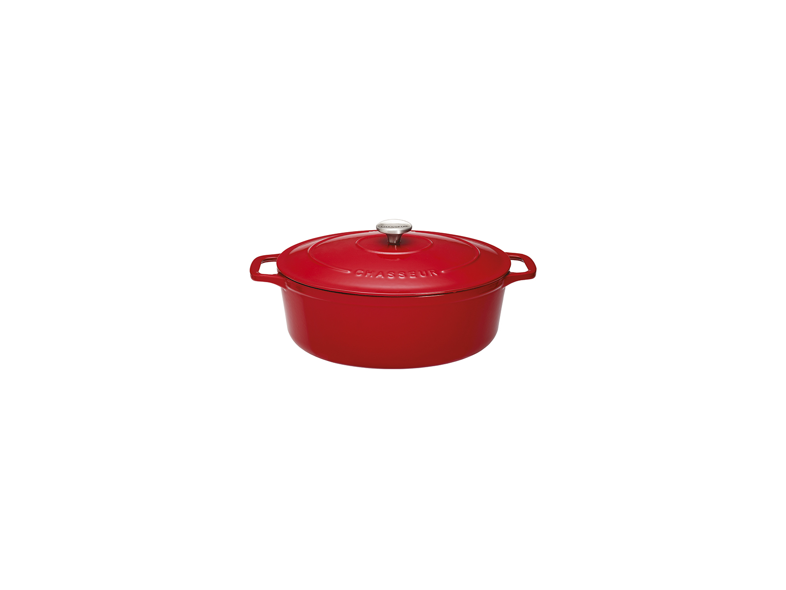 This oval Chasseur cast iron pot from Matfer Bourgeat combines classic design with superior functionality. With dimensions of 31x26 cm and a capacity of 6 liters, it offers ample space for both everyday meals and festive gatherings. The red enamel finish not only adds an elegant touch but also enhances the pot's durability and user-friendliness.