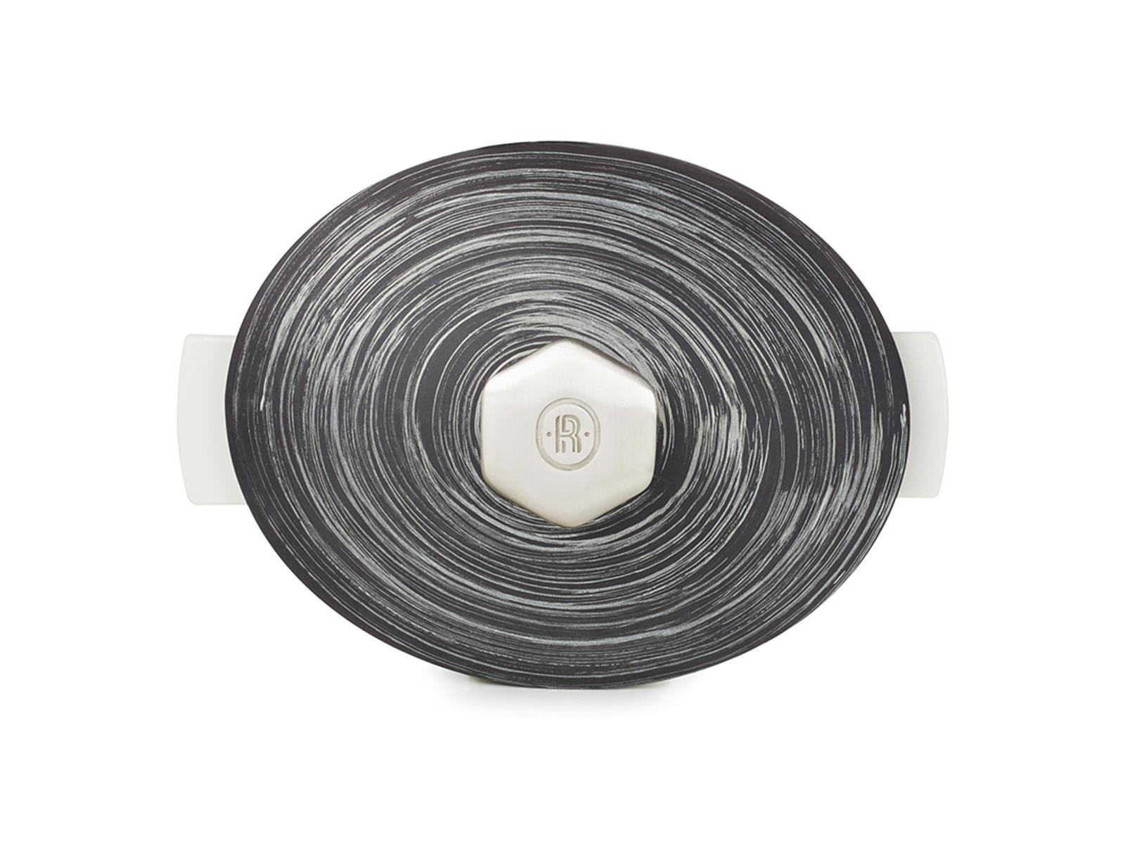 This lid measures 32.5x26.5 cm, perfectly fitting the corresponding oval pot from the Revolution 2 series. With a height of 70 mm and a weight of 1.6 kg, the lid is both robust and practical. The unglazed finish in black with golden details creates a sophisticated look that fits into both modern and classic kitchens. The lid is part of Revol's innovative Revolution 2 series, where design and functionality go hand in hand.