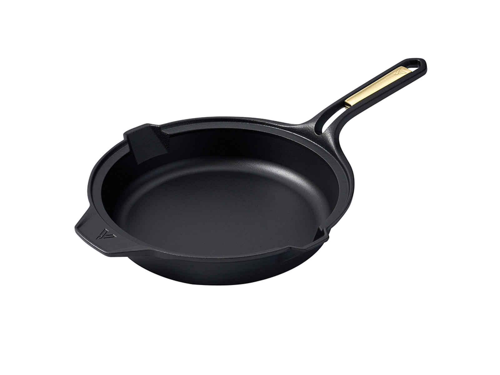 The sleek handle with air vents and brass inserts is designed to stay cooler for longer during cooking. Its ergonomic shape with a raised design ensures a stable grip, even when handling heavy dishes. The practical pouring spouts on both sides make it easy to pour sauces or excess liquids without spilling. The textured surface of the pan contributes to excellent heat distribution, keeping food warm for longer.