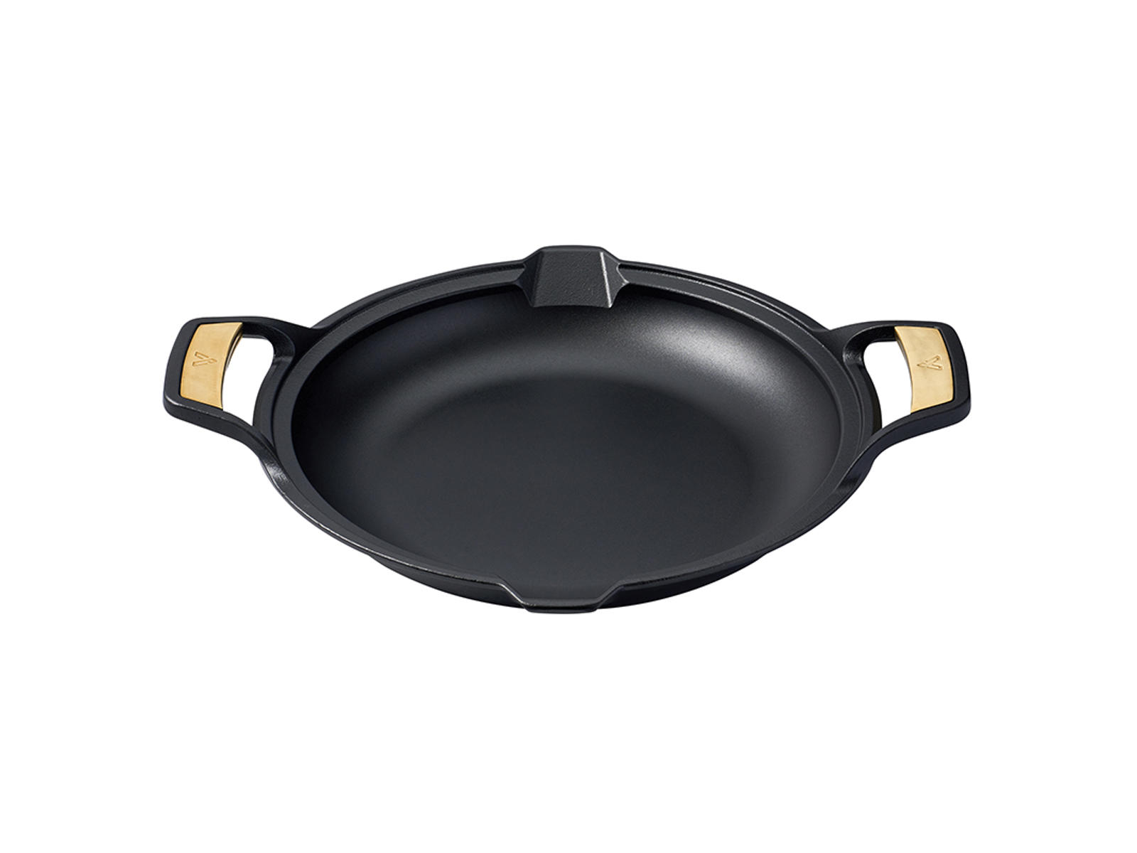 The textured surface ensures even heat distribution and retains heat longer, delivering perfect cooking results every time. The sleek handles with air vents and brass insets are designed to stay cooler for longer during cooking. The elevated design and ample space on the handles make handling safe and comfortable. The two practical pouring spouts make it easy to pour sauces or excess liquids without spilling.