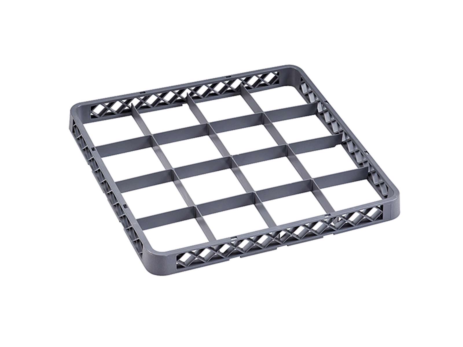 Made from durable gray polypropylene that withstands high temperatures and repeated use. Measures 500x500x45mm, fitting standard baskets in professional dishwashers. The 16 separate compartments are designed to accommodate various types and sizes of glasses while keeping them securely apart throughout the washing process.