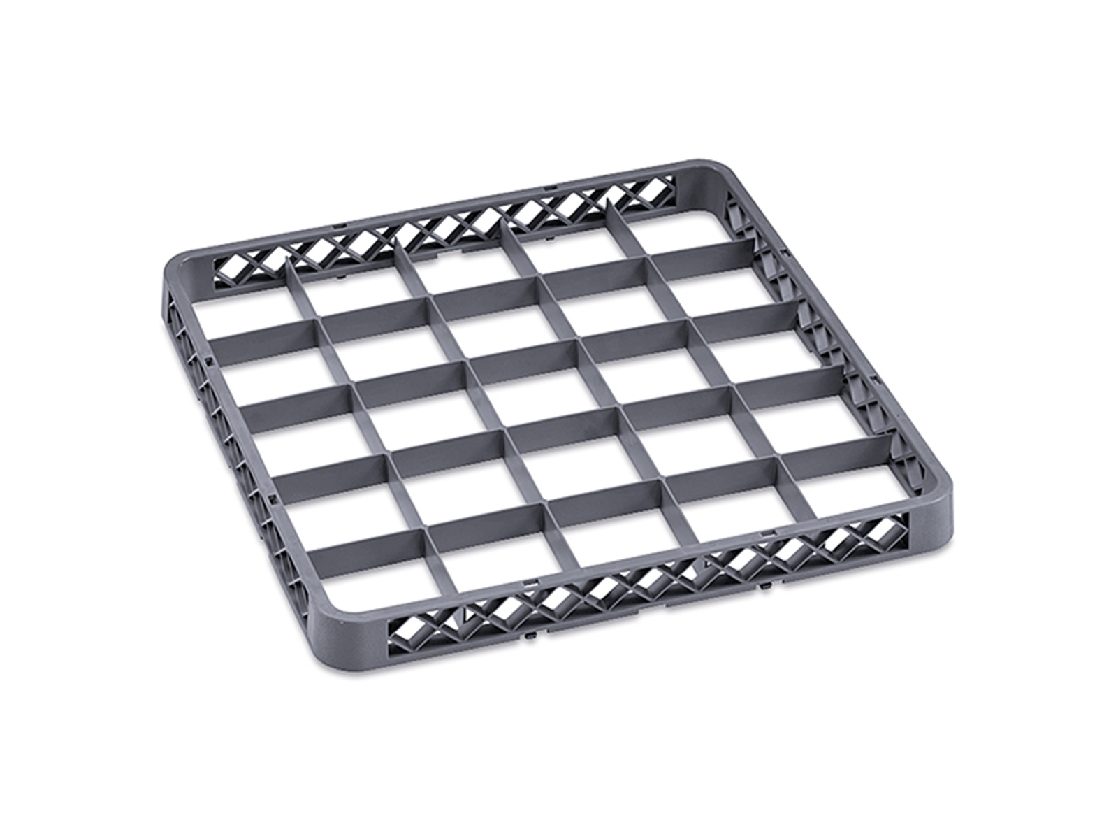 The spacer frame is specifically designed for dishwashing trays with 25 compartments in standard size 500x500 mm.