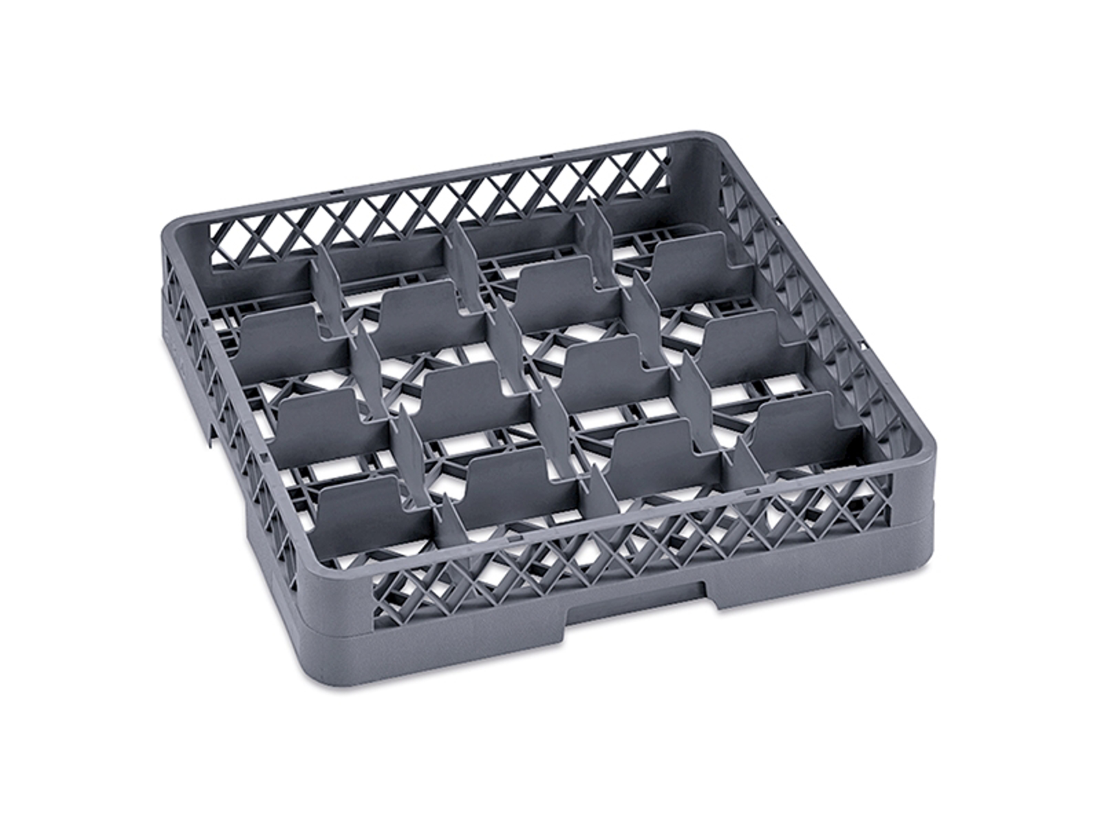 This gray polypropylene dish rack is specifically designed for the efficient washing of glasses and cups. With its 16 separate compartments, the rack ensures that your glasses and cups remain stable throughout the washing process. The dish rack measures 500x500x100mm, making it compatible with most professional dishwashers.