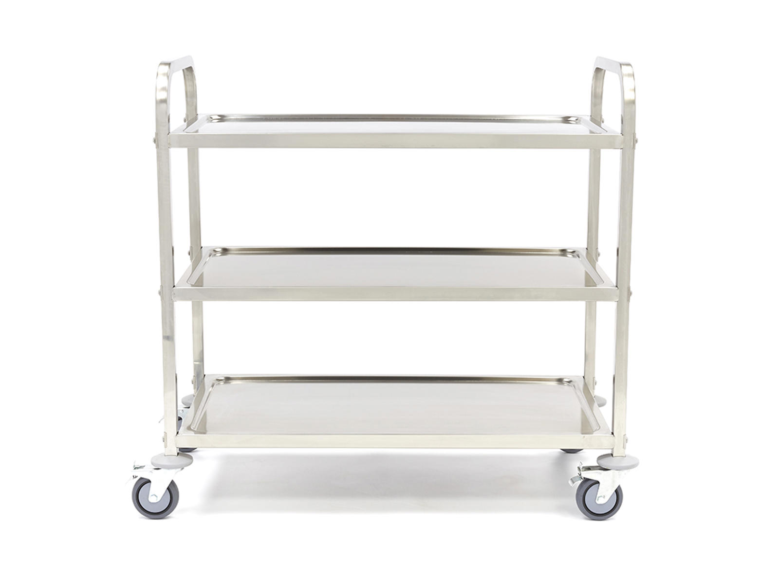 Two of the four wheels are equipped with brakes, allowing you to secure the cart in place when it is stationary.