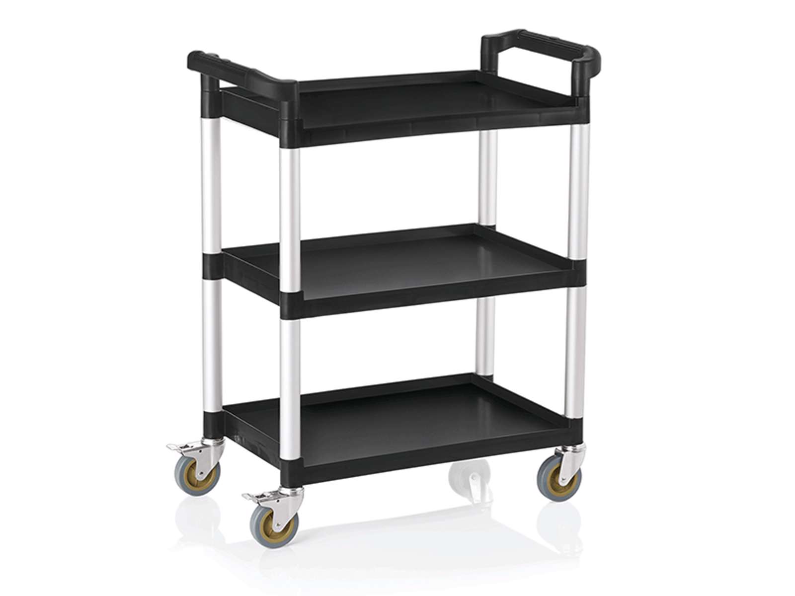 This professional transport trolley in black polypropylene and anodized aluminum combines durability with mobility. With three sturdy shelves and a total load capacity of 150 kg, it is designed for efficient transportation of dishes, food items, and tools in busy kitchen environments.