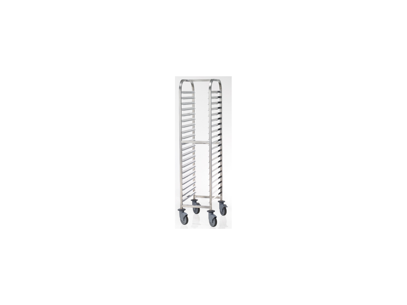 The transport cart has 20 shelves/rails with 6.7 cm spacing, allowing space for 20 GN 1/1 trays.