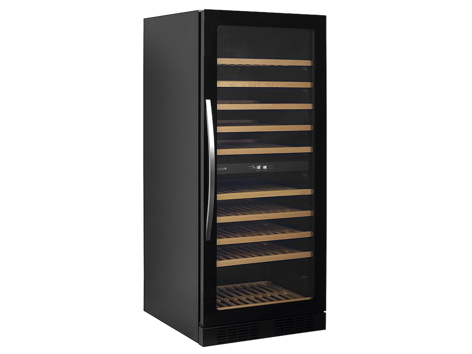 With a noise level of only 40 dB(A), this wine cooler operates almost silently, making it suitable for placement in both quiet home environments and busy restaurants. The frameless glass door with a stainless steel handle and the black cabinet give the unit a modern, minimalist look. The interior LED lighting showcases your wines invitingly through the glass door, while the black interior creates a striking contrast with the bottles.