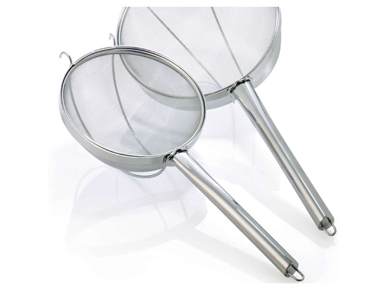 This industrial sieve from Karl Weis is made of stainless steel with a diameter of 26 cm and comes with a replaceable insert. The robust construction features double protective brackets and two support brackets, ensuring durability and stability even under intensive use in professional kitchens. The tubular handle with an oval eye provides a comfortable grip during operation.
