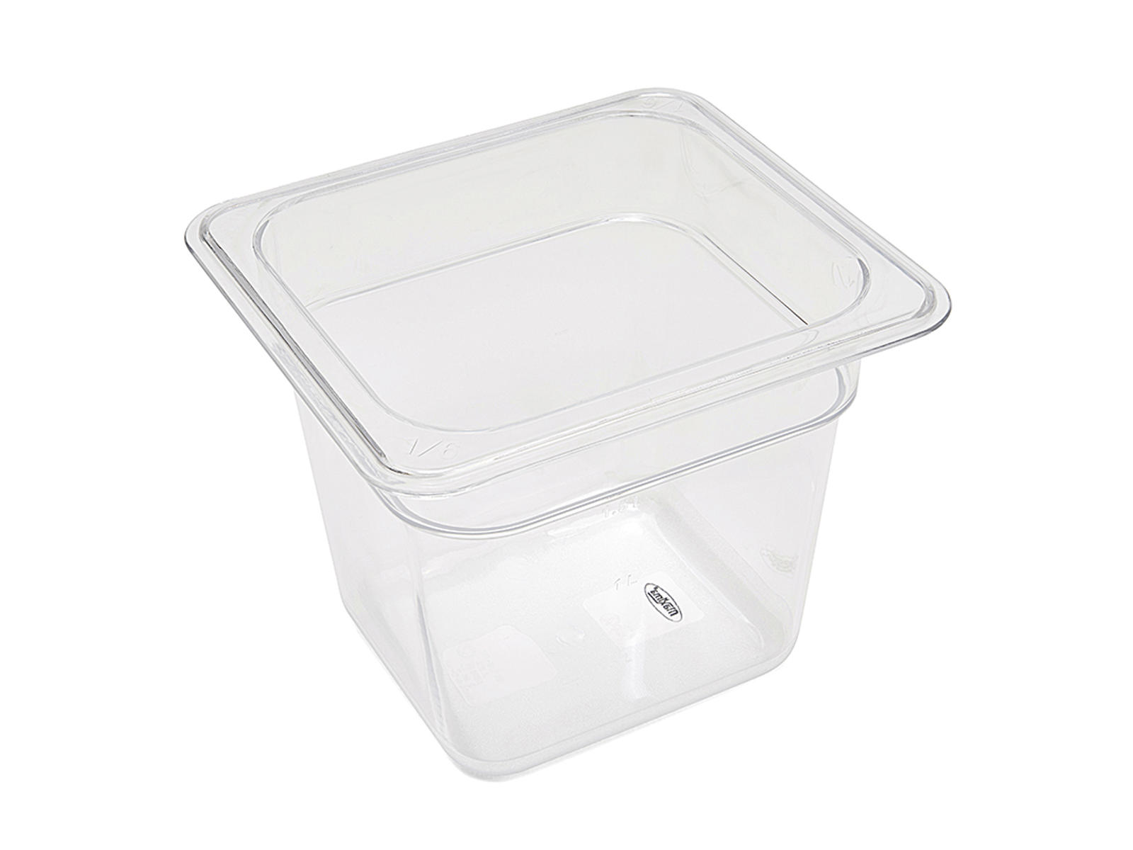 This Maxima container in 1/9 GN format is made from durable, transparent polycarbonate with a capacity of 0.6 liters. With precise dimensions of 174 x 107 mm and a height of 64 mm, it fits perfectly into standardized kitchen systems, giving you full control over the contents.
