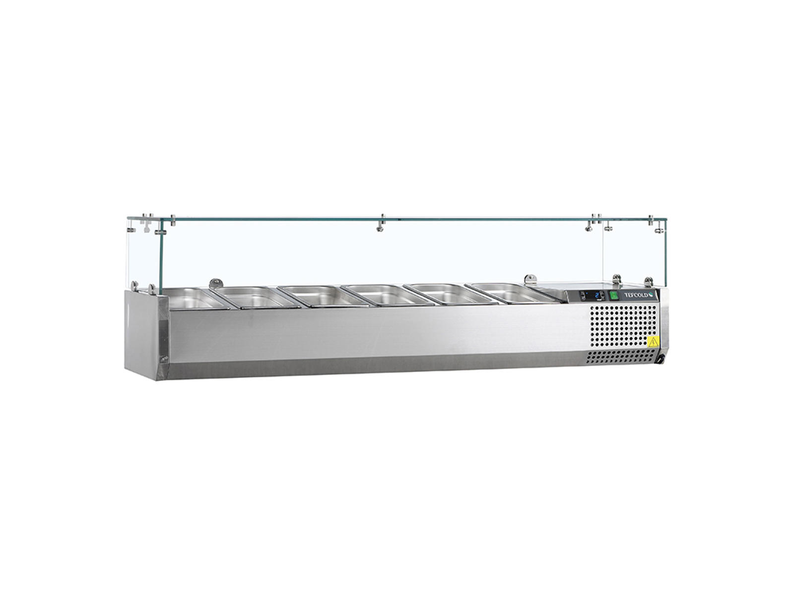 The Tefcold GVC38-150 is a professional stainless steel refrigerated countertop designed to keep ingredients cold and easily accessible. It accommodates 6 GN1/3 containers (not included) and maintains a consistent temperature between +2 and +8°C with its digital display and electronic controls.