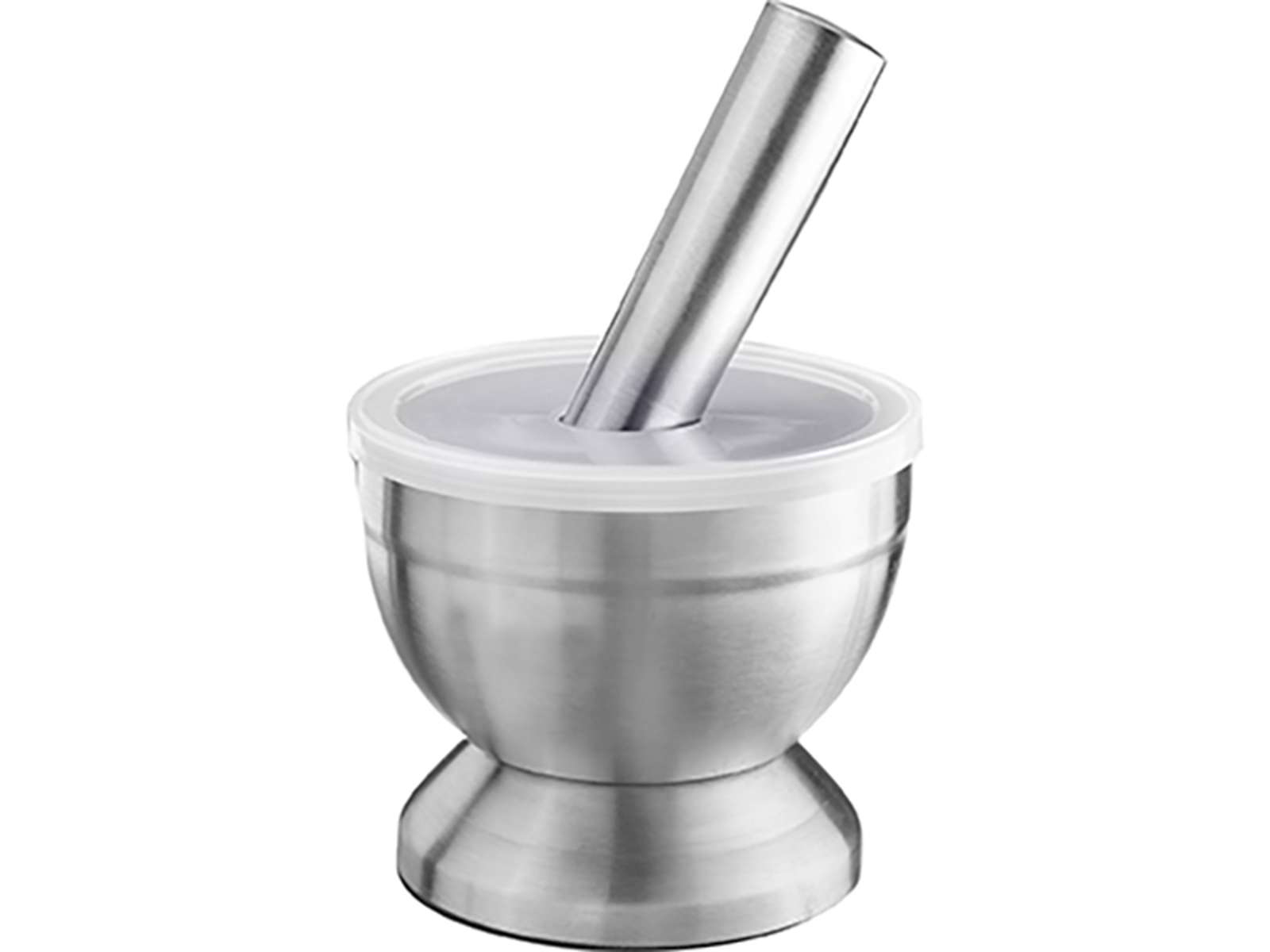 - A durable stainless steel mortar with a practical lid
