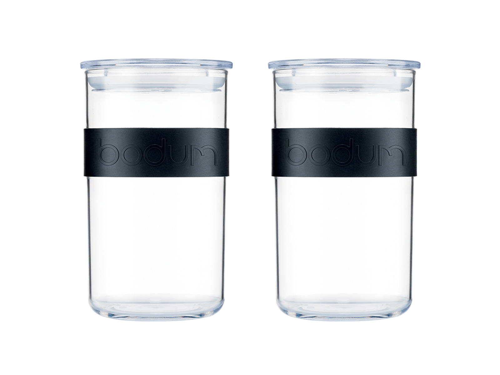 The Bodum Presso storage set includes two 1-liter containers with black rubber bands, combining functionality with a sleek design. These versatile containers are made from durable plastic with silicone rubber bands that ensure an airtight seal. The 1-liter capacity of each container makes them suitable for a variety of foods and leftovers.