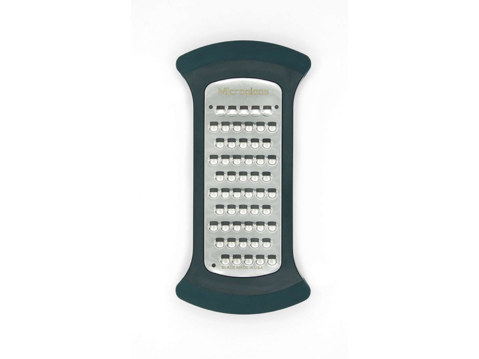 This green Microplane grater is specially designed to fit over bowls of various sizes. With ultra-sharp stainless steel blades, the grater ensures efficient and coarse grating of hard cheeses, spices, ginger, and many other ingredients. Weighing only 162 grams, it is made from durable materials that are free from BPA and phthalates.