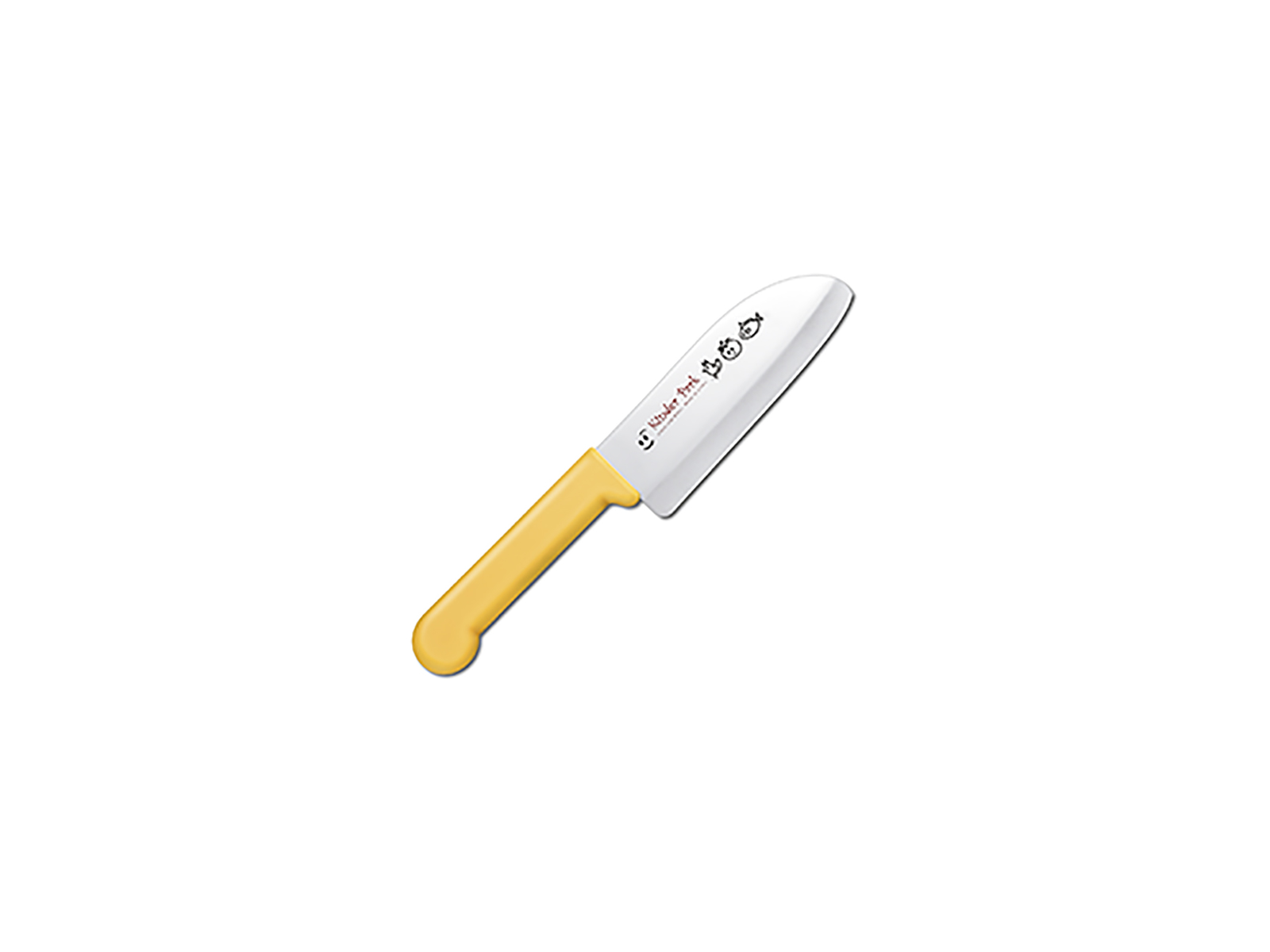Tojiro's 12 cm children's knife combines professional quality with thoughtful safety features. The efficient steel blade is gently rounded to protect small hands, while the rubber/polypropylene handle ensures a stable grip. This yellow children's knife is designed to introduce kids to the world of cooking under adult supervision.