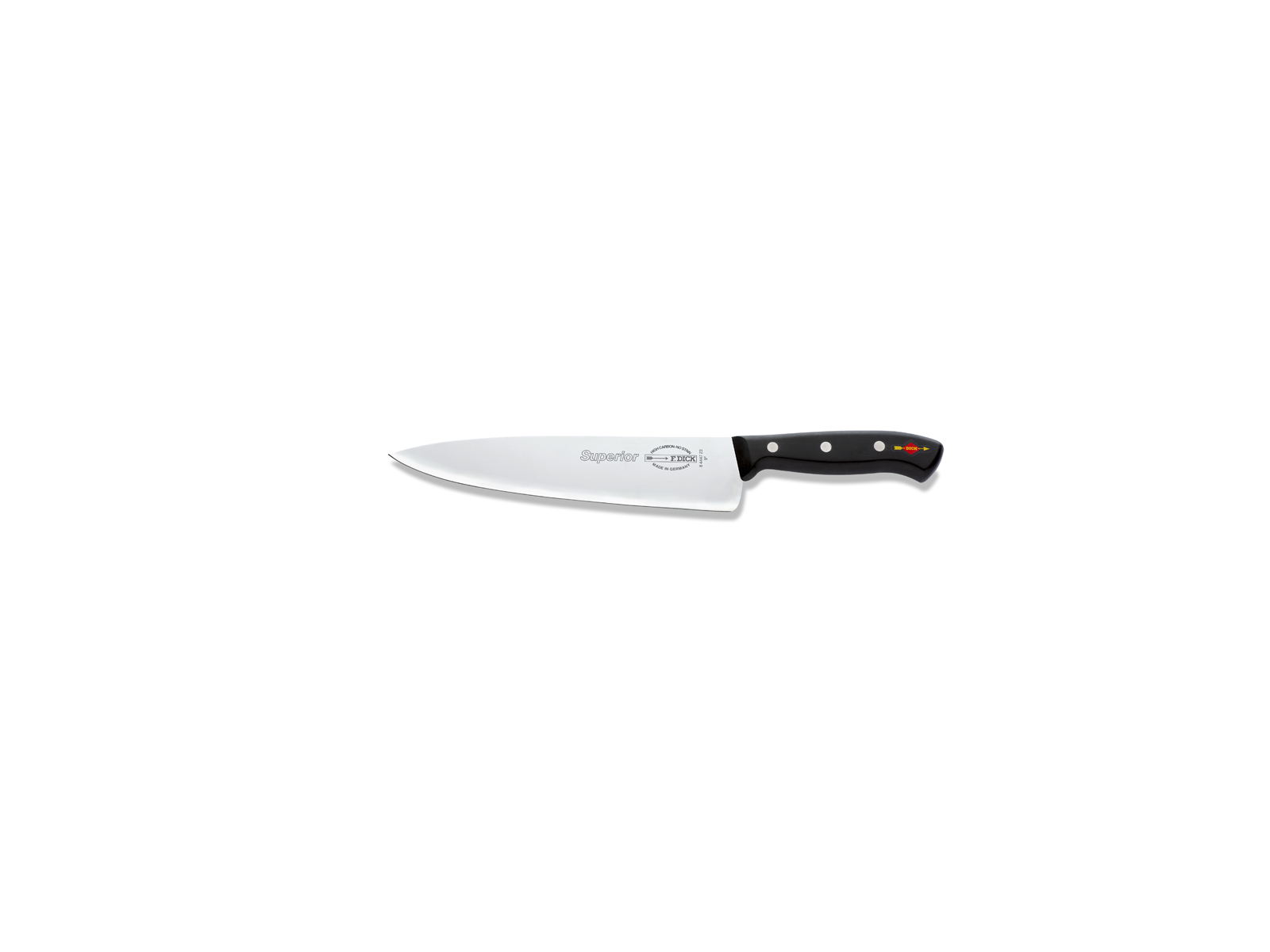 With the F. Dick Superior chef's knife, you receive: • A professional chef's knife with a 23 cm blade made of high-quality X50CrMoV15 steel • Ergonomic synthetic handle for safe handling and reduced wrist fatigue • Seamless joints for optimal hygiene and longevity