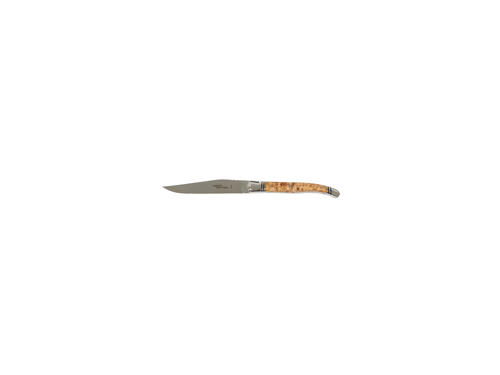 Every Laguiole Prestige steak knife is the result of generations of knife-making artistry. The hand-carved patterns (guilloché) on both the spring and blade make each knife unique. The iconic bee is not simply attached, but forged as an integral part of the spring and meticulously polished by hand. The two stainless steel bolsters give the knife a solid appearance and excellent balance. The birch wood handle is carefully selected for its fine grain and natural color variations, which impart a bright and refined character to the knife.