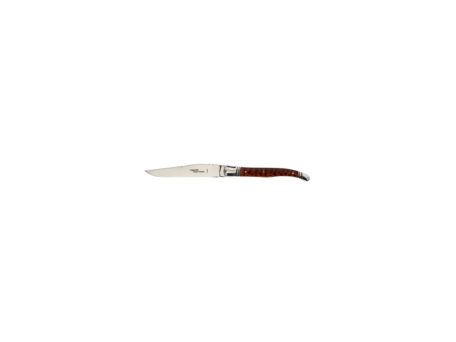 This Laguiole Prestige steak knife, crafted from stainless steel with a handle made of snakewood, combines French knife tradition with modern cooking. The sharp stainless steel blade and luxurious snakewood handle make every slicing motion a pleasure. Perfect for everyday meals and special occasions where the table setting deserves a touch of exclusivity.