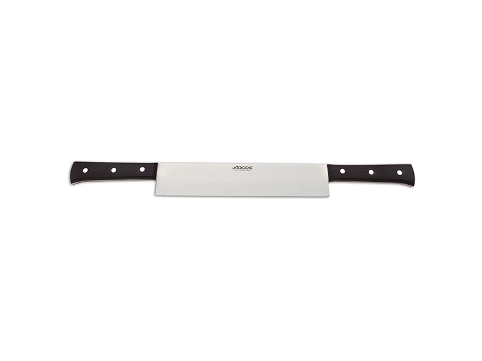 This Arcos Universal cheese knife with dual handle is specifically designed for handling large cheeses. With a 26 cm long blade made of Nitrum® stainless steel and two ergonomic POM (polyoxymethylene) handles, you gain optimal control and strength to cut through even the hardest types of cheese.