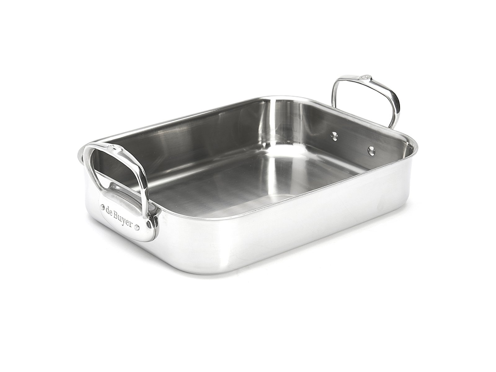 This 35x25 cm roasting pan from De Buyer's Affinity series combines stainless steel and aluminum in a thoughtful multi-layer construction. With its gently curved sides, rounded corners, and sturdy cast handles, the roasting pan is designed for both kitchen functionality and elegant serving right at the table. It's ideal for preparing everything from roasts and fish to vegetable dishes.