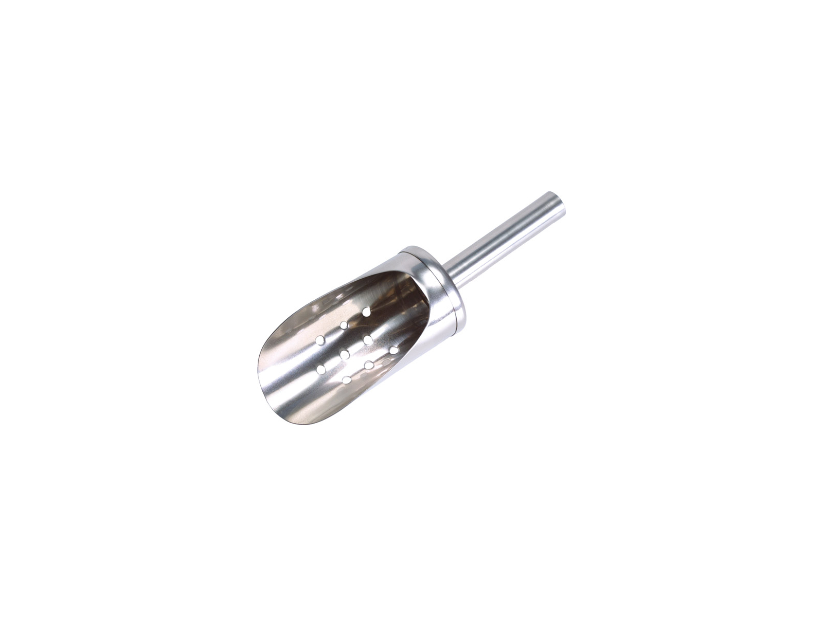 This large ice scoop from APS is made from durable stainless steel featuring a practical perforated design that allows meltwater to flow back into the ice box. With a diameter of 5 cm and a height of 195 mm, it is designed for efficient and hygienic handling of ice in both professional and private settings.