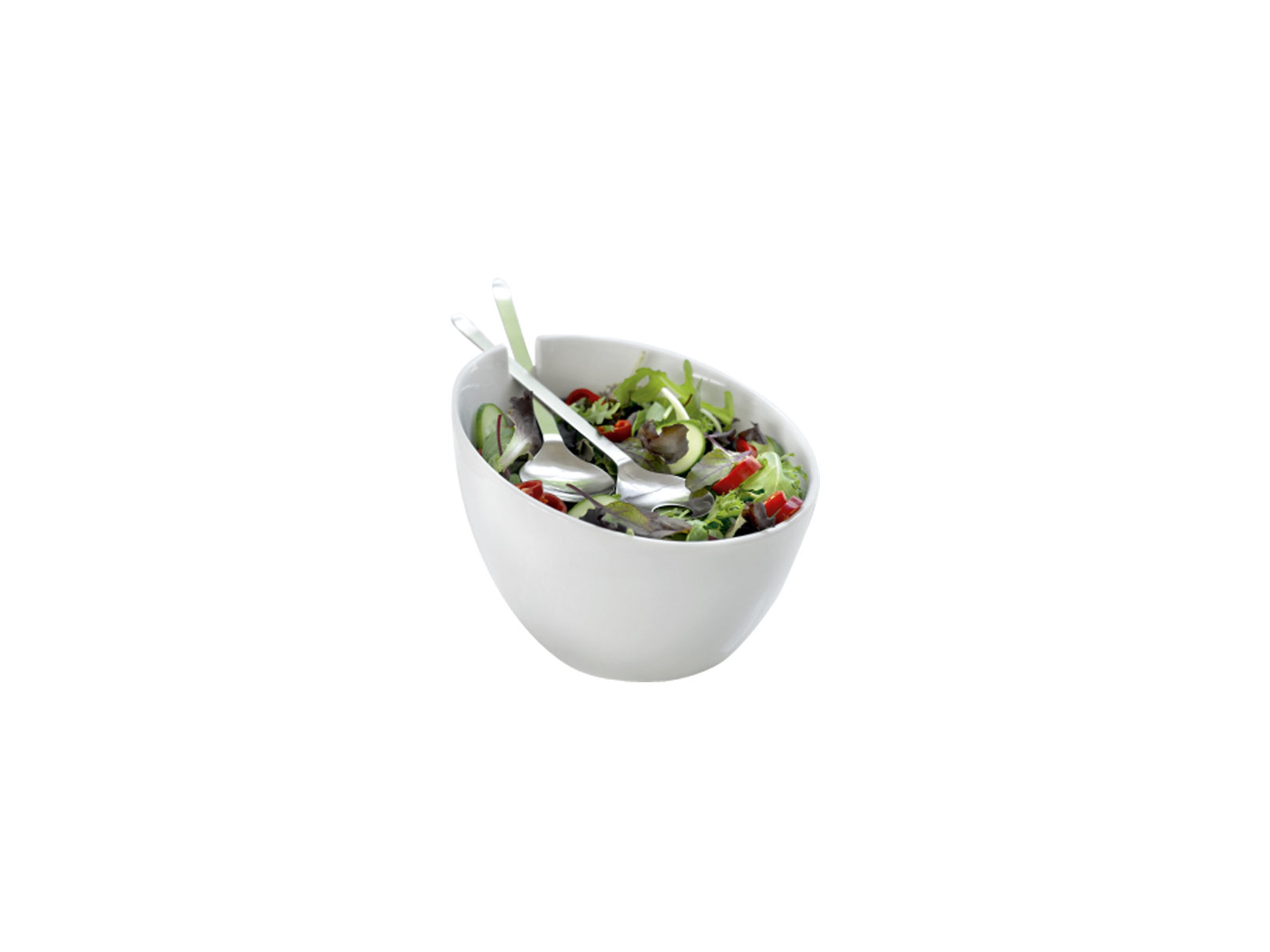 The salad bowl features a gently sloped edge that makes serving easy and precise. A discreet notch on the rim serves as a practical holder for the included salad utensils, so you'll never have to search for serving tools. The white porcelain creates a beautiful contrast with the matte brushed steel, giving the set a timeless look that fits into any kitchen and dining table setting.