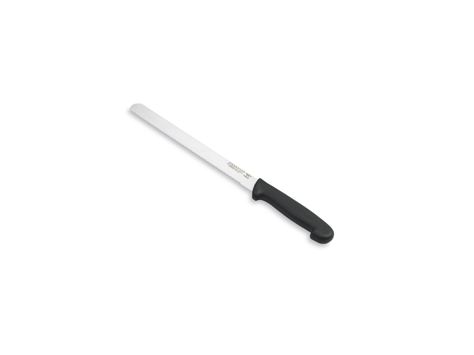 This 25 cm bread knife with a Granton edge is crafted from stainless Sheffield steel, ensuring long-lasting sharpness. The serrated blade effortlessly glides through both freshly baked bread and ingredients with hard or tough surfaces, without crushing them. The black polypropylene handle provides a secure grip during use.