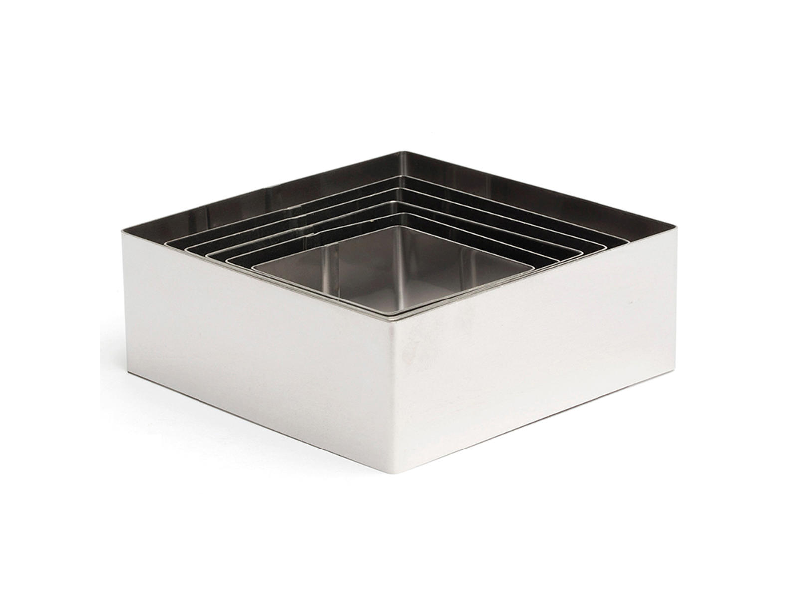The square molds ensure uniform portions every time, which is essential for reducing food waste and managing costs. Stainless steel is a hygienic choice in the kitchen, as the material is easy to clean and does not affect the taste of the food. The molds can be used for both cold and hot dishes, making them a versatile tool in the professional kitchen.