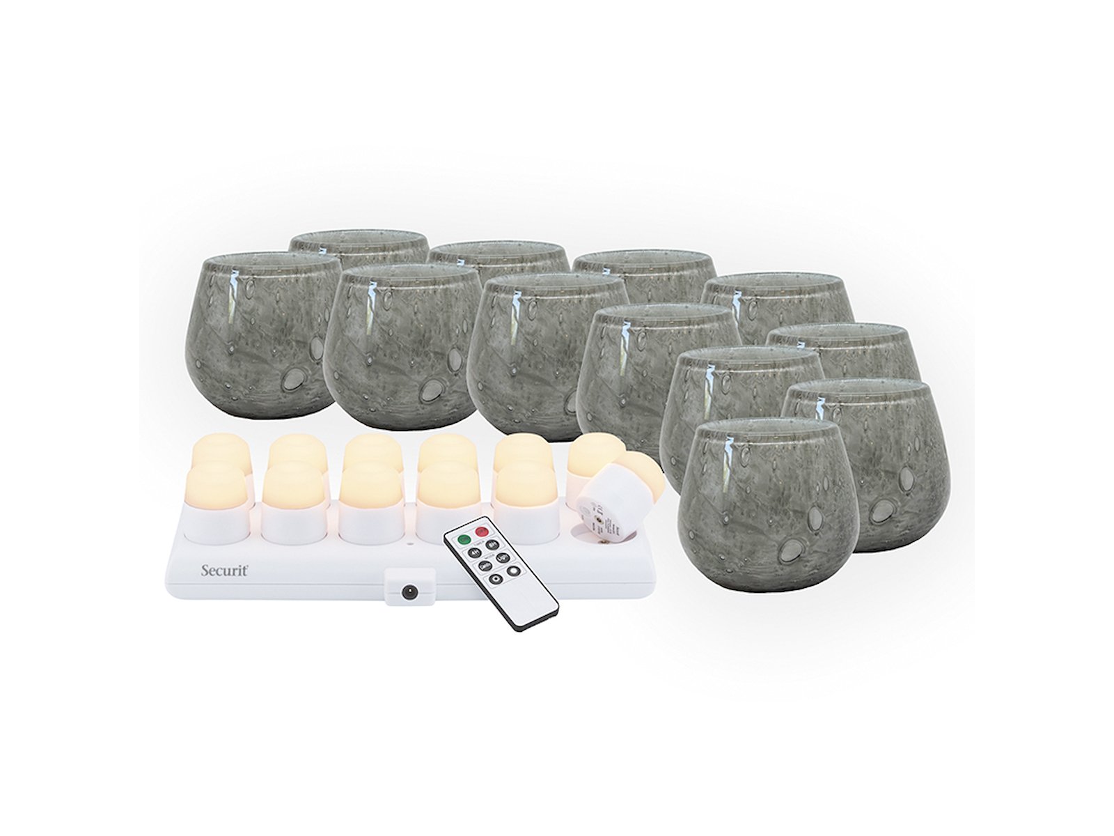 The Securit Luna candle holder set combines elegant hand-blown glass design with modern LED technology. The set includes 12 gray candle holders made from recycled glass, each featuring its own unique pattern, along with 12 LED tealights that create a realistic flame effect. This set is made in the EU and designed for both professional environments and home use.