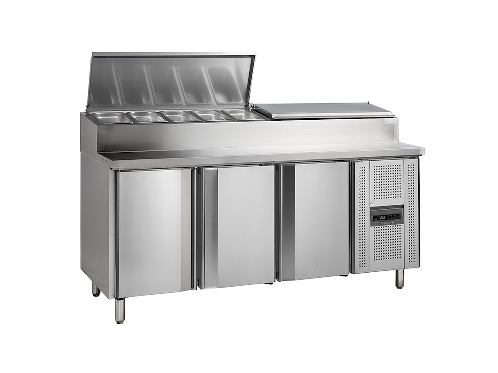 Constructed from SS304 stainless steel both inside and out, this saladette is built to withstand daily use in busy kitchens. The three self-closing doors ensure that the cold air is retained, while the adjustable legs allow for height customization to suit your kitchen's needs. With a capacity of 497 liters and three GN1/1 shelves in the undershelf, you have ample storage space. The electronic thermostat provides precise temperature control, and with automatic defrosting, maintenance is minimized.