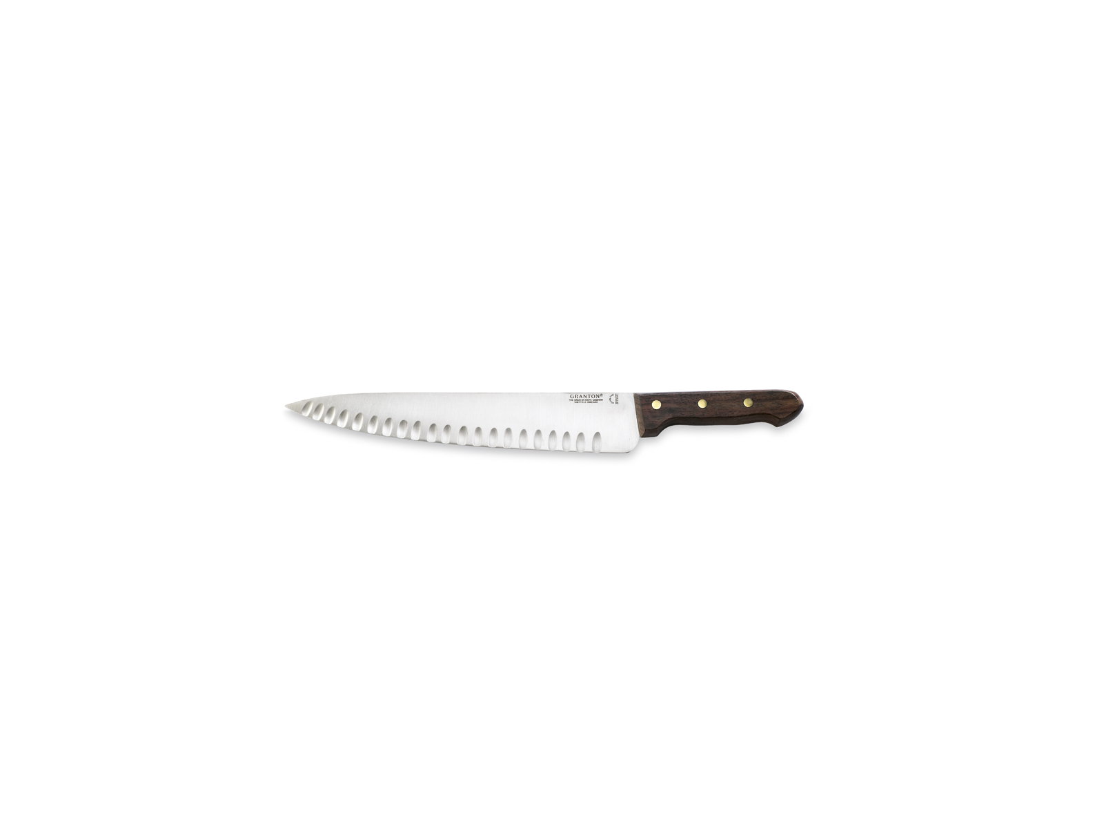 This 31 cm Granton carving knife with air pockets and a wooden handle is a specialized tool designed for slicing meat, fish, vegetables, and bread. The long blade made of Sheffield steel features innovative air pockets that reduce friction and prevent food from sticking to the blade. It is ideal for precision slicing at the table, where perfect, thin slices make all the difference.