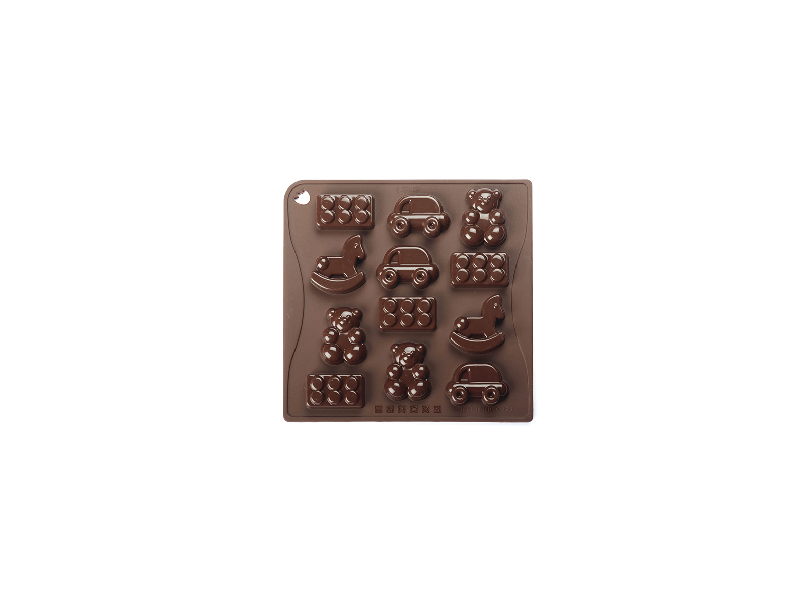 The chocolate mold measures 180x175x15 mm and weighs only 80 grams, making it easy to handle. It is made from food-grade silicone that withstands temperatures from -40°C to +230°C. This allows you to use the mold for a variety of purposes, from freezing chocolate to baking in the oven. The mold accommodates 12 individual chocolates with a toy motif, all coming out with sharp and clear details.